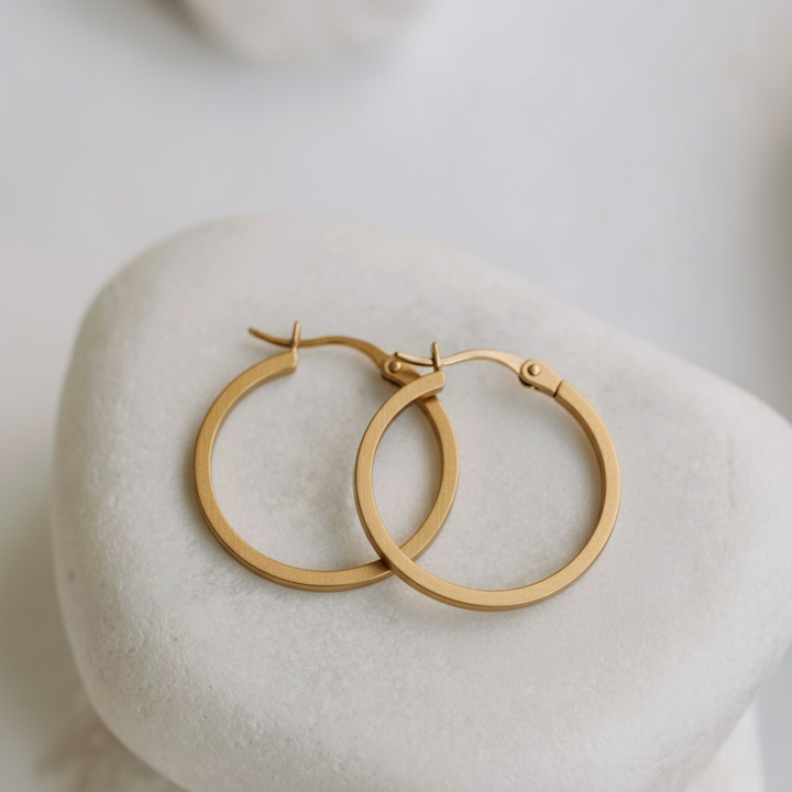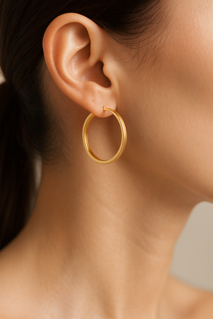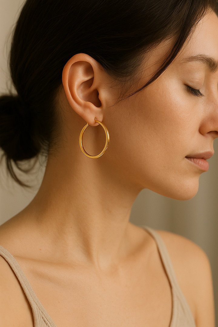 Timeless and effortlessly elegant, The Solis Hoops are an essential staple in any jewelry collection. Their clean, circular silhouette and high polish finish create a luminous glow that catches the light with every turn. Lightweight and easy to wear, these quarter sized hoops offer just the right balance of minimalism and everyday luxury. A secure hinged clasp ensures all day comfort and confidence.